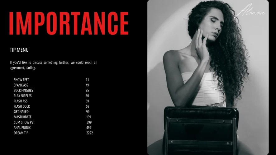 Dance érotique, Fessée, Yoga, Talons, Doggy style, Fétichisme des pieds, Strip-tease, Masturbation, Show huileux, SPH, Branlette, Masturbation guidée, Humiliation